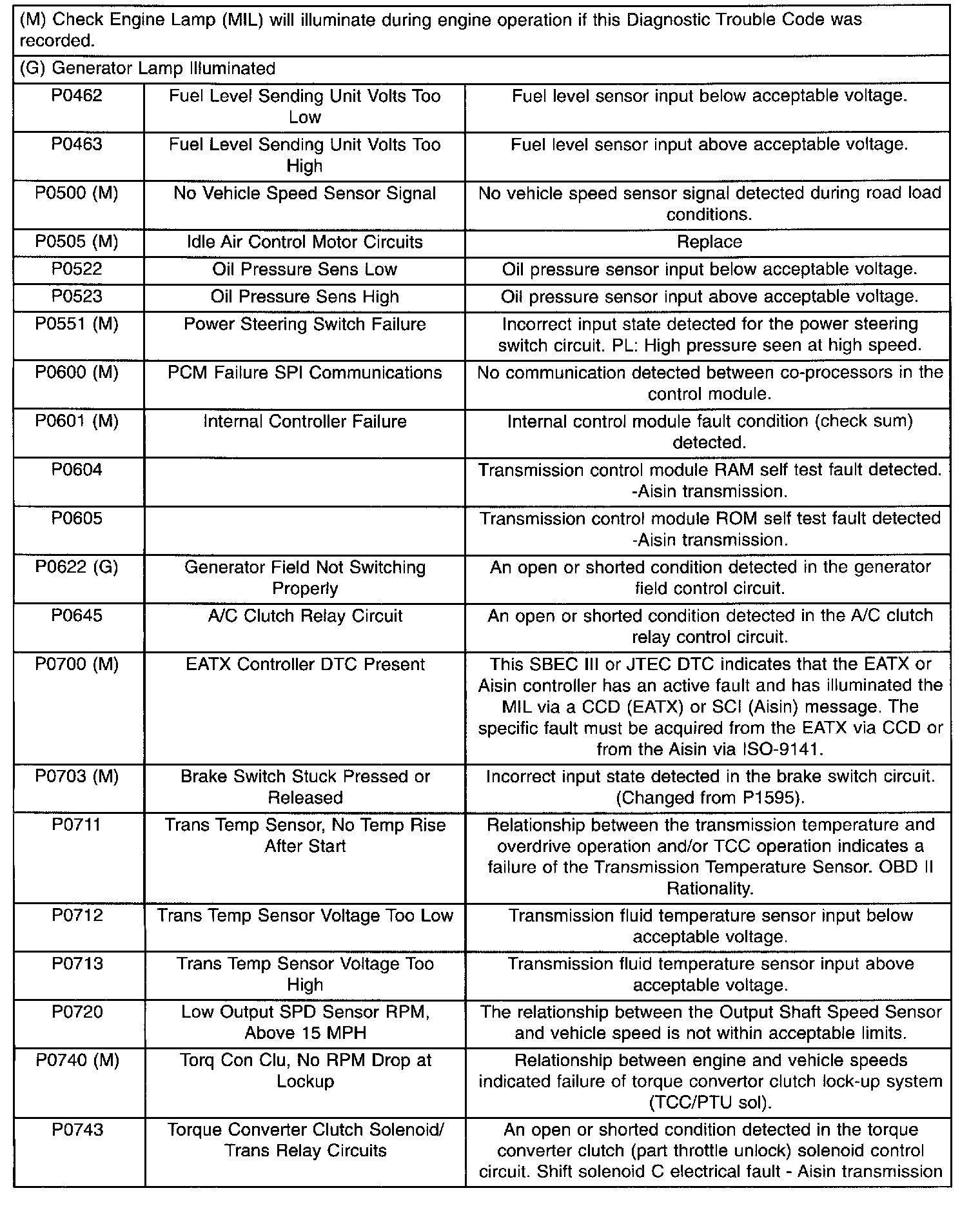Diagnostic Trouble Code Descriptions (P0462 To P0743):