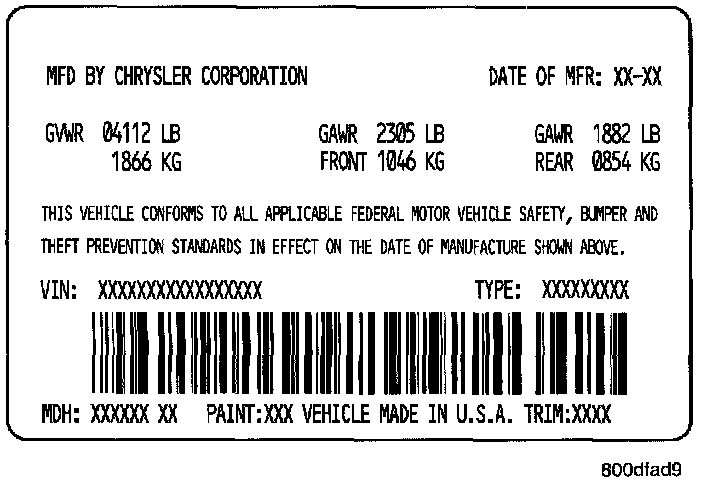 A vehicle safety certification label is attached to the rear facing of the driver's door. This label indicates date of manufacture -- month and year, Gross Vehicle Weight Rating (GVWR), Gross Axle Weight Rating (GAWR) front, Gross Axle Weight Rating (GAWR) rear and the Vehicle Identification Number (VIN). The Month, Day and Hour of manufacture is also included.