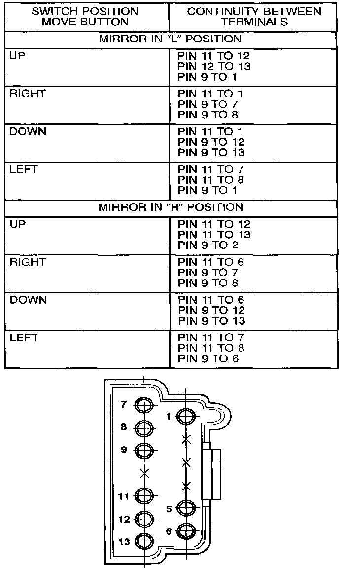 4. Using an ohmmeter, test for continuity between the terminals of the switch as shown in the Mirror Switch Test table.