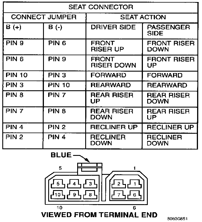 4. To test the seat motors and verify proper seat responses, and the Seat Motor Test table. Using two jumper wires, connect one to a battery supply and the second to a ground. Connect the other ends to the seat wire harness connector as described in the Seat Motor Test table.