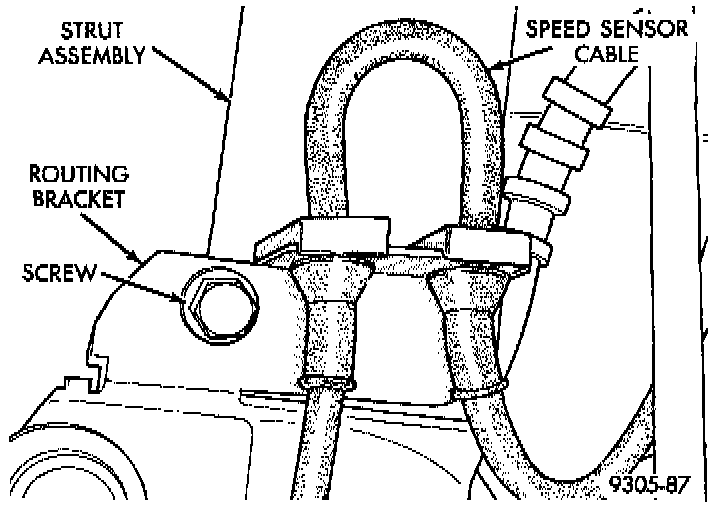 CAUTION: When installing the wheel speed sensor cable routing bracket on the strut, the speed sensor cable must be looped upward as shown. If speed sensor cable is not routed in this direction it may rub, damaging the speed sensor cable.