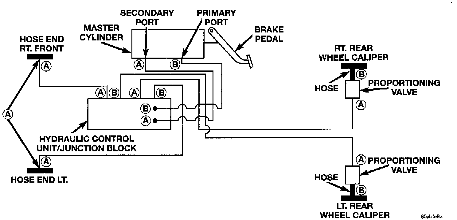 The antilock braking system, uses the standard power brake system caliper assemblies, braking discs, pedal assembly, brake lines and hoses. The unique parts of the antilock braking system consists of the following components. Unique, wheel speed sensors, tone wheels, electronic control unit and the antilock hydraulic control unit. These components will be described in detail in the antilock brake section in this group of the service manual.