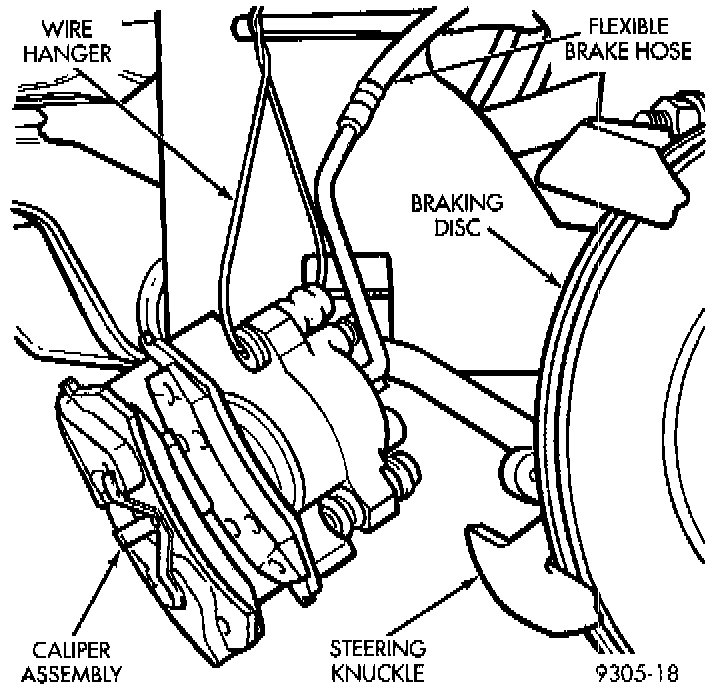 6. If the caliper is not being completely removed from the vehicle, support the caliper firmly to prevent weight of caliper from damaging the flexible brake hose.