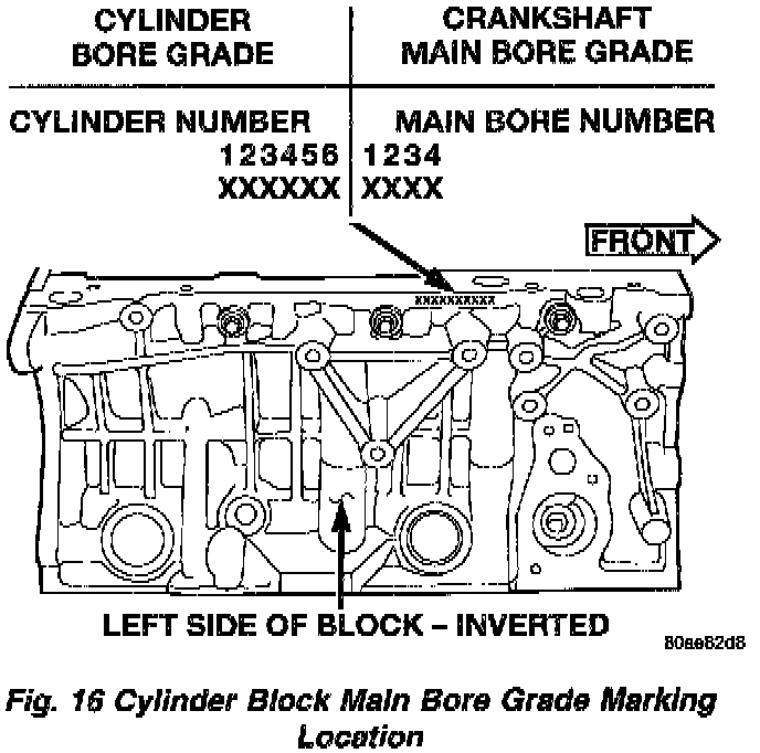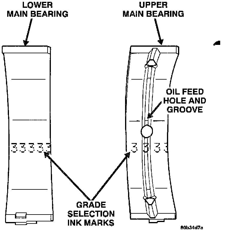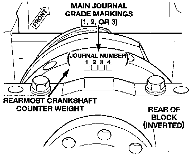 The main bearings are "select fit" to achieve proper oil clearances. For main bearing selection, the block and crankshaft have grade identification marks.