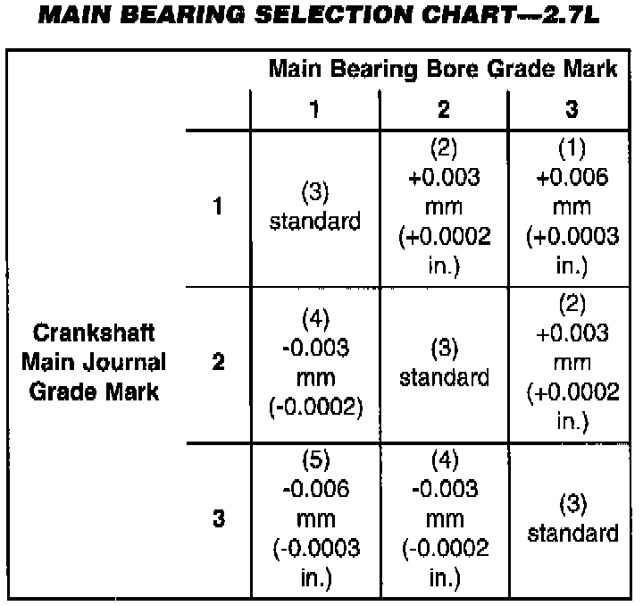 Use the Main Bearing Selection Chart to properly select the main bearings. For an example, if the main bore grade is 3 and the journal grade is 2, the proper select fit bearing would be (2) +0.003 mm (+0.0002 inch).
