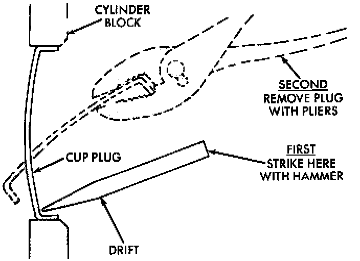 Using a blunt tool such as a drift or a screwdriver and a hammer, strike the bottom edge of the cup plug. With the cup plug rotated, grasp firmly with pliers or other suitable tool and remove plug.