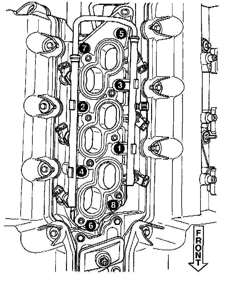 4. Install manifold attaching bolts and tighten in sequence to 12 Nm (105 inch lbs.). Remove bolt used for aligning manifold.