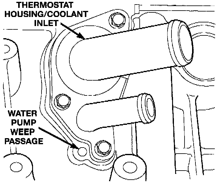 NOTE: It is normal for the water pump to weep a small amount of coolant from the weep hole (black stain on water pump body). Do not replace the water pump if this condition exists. Replace the water pump if a heavy deposit or a steady flow of engine coolant is evident from the weep passage. This indicates a shaft seal failure and pump must be replaced. Be sure to perform a thorough analysis before replacing water pump.