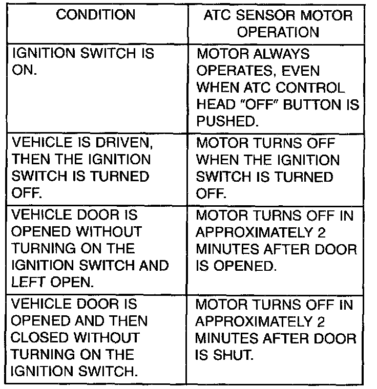 The Automatic Temperature Control (ATC In-Car Temperature Sensor returns electrical signals to the Body Control Module (BCM). The In-Car Temperature Sensor is used on ATC equipped vehicles only. The In-Car Temperature Sensor is made up of two parts. One part is the in-car sensor motor fan assembly and the second part is a temperature thermistor. The in-car sensor motor fan assembly attaches to the back of the ATC Control head. This assembly has a small fan and a motor which draws air through the intake on the front of the ATC control. The in-car sensor thermistor is located inside of the ATC Control Head. Air drawn from the passenger compartment by the in-car sensor motor-fan assembly, flows over the thermistor. The in-car sensor thermistor changes resistance with air temperature. The BCM measures this resistance and calculates the temperature of the air drawn into the ATC Control. The ATC system then makes adjustments to maintain the optimum passenger compartment comfort. Refer to the ATC Sensor Motor-Fan Operation table for when the ATC Sensor is operating.
