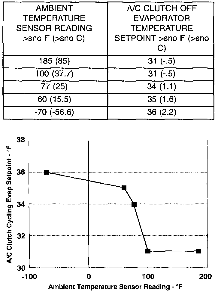 The evaporator temperature sensor is a temperature sensing element located at the coldest point on the face of the evaporator. Output from the probe is sampled by the Body Control Module (BCM). The sensor is used to switch the A/C compressor clutch OFF before evaporator freeze up occurs. The temperature setpoint at which the clutch is turned OFF varies with the outside ambient temperature. The temperature at which the clutch is turned ON is preset to 2° F above the OFF setpoint mentioned above. Refer to Evaporator Temperature Sensor Set-point table and for the correct setpoint.