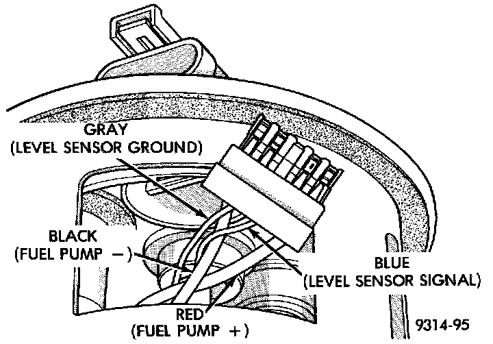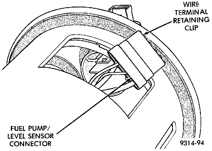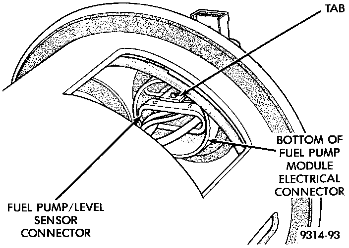 1. Depress the retaining tab and remove the fuel pump/level sensor connector from the bottom of the fuel pump module electrical connector.