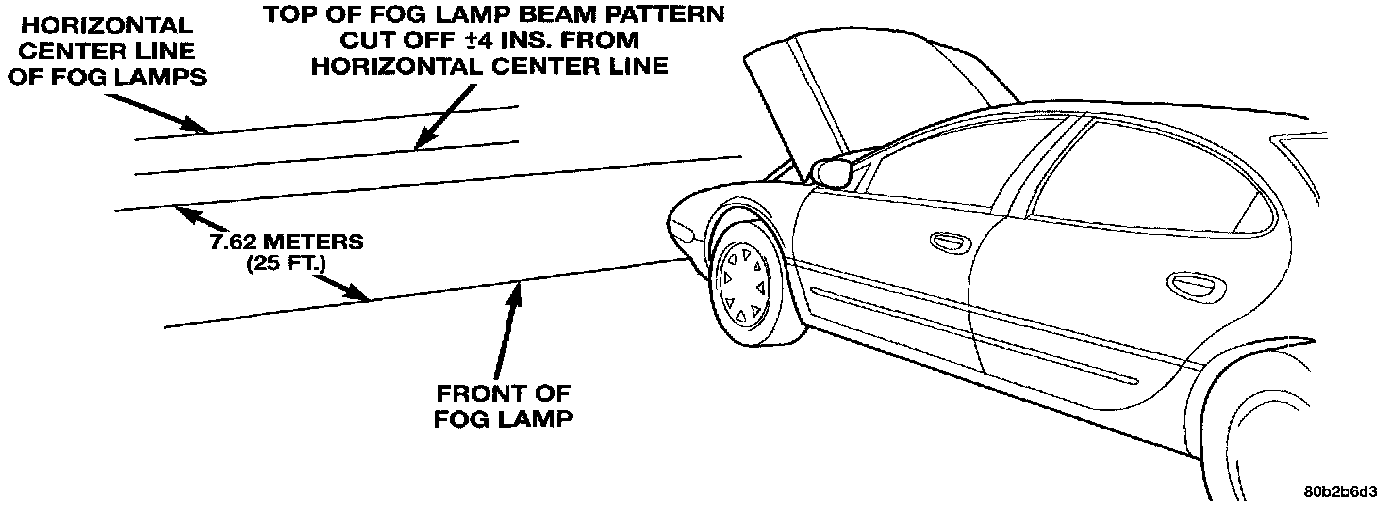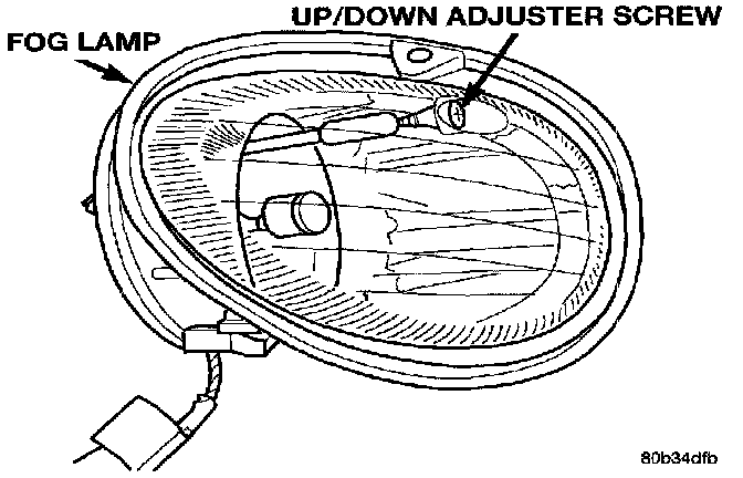 Fog Lamp AlignmentPrepare an alignment screen. Refer to Alignment Screen Preparation paragraph. A properly aligned fog lamp will project a pattern on the alignment screen 100 mm (4 in.) below the fog lamp center line and straight ahead. To adjust fog lamp alignment. rotate the alignment screw.