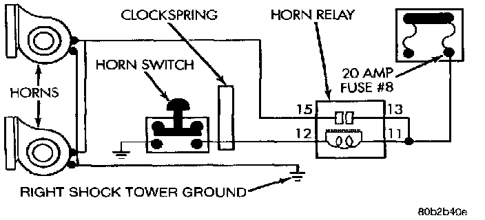 The horn circuit consists of a horn switch, horn relay, and horns. The horn circuit feed is from the fuse to the horn relay in the Junction Block. When the horn switch is depressed, it completes the ground circuit. Then the horn relay coil closes a set of contacts which allows current to flow to the horns. Refer to Horn System Schematic.