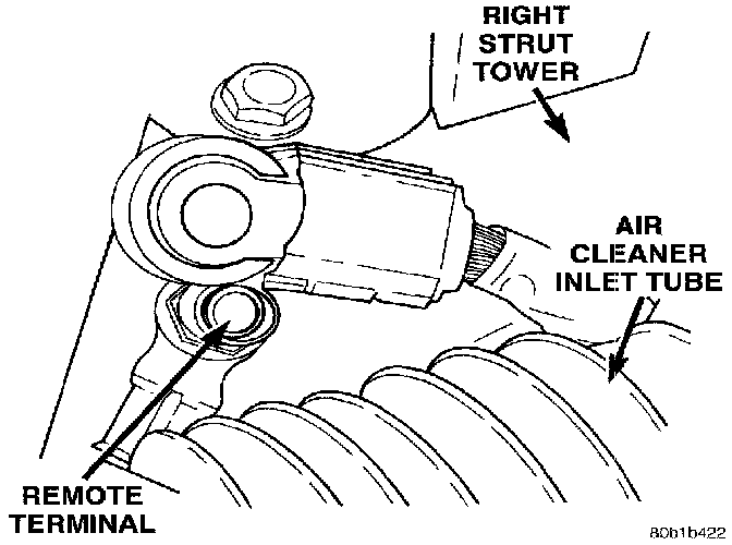1. Open hood and disconnect the negative battery cable remote terminal from the remote battery post.