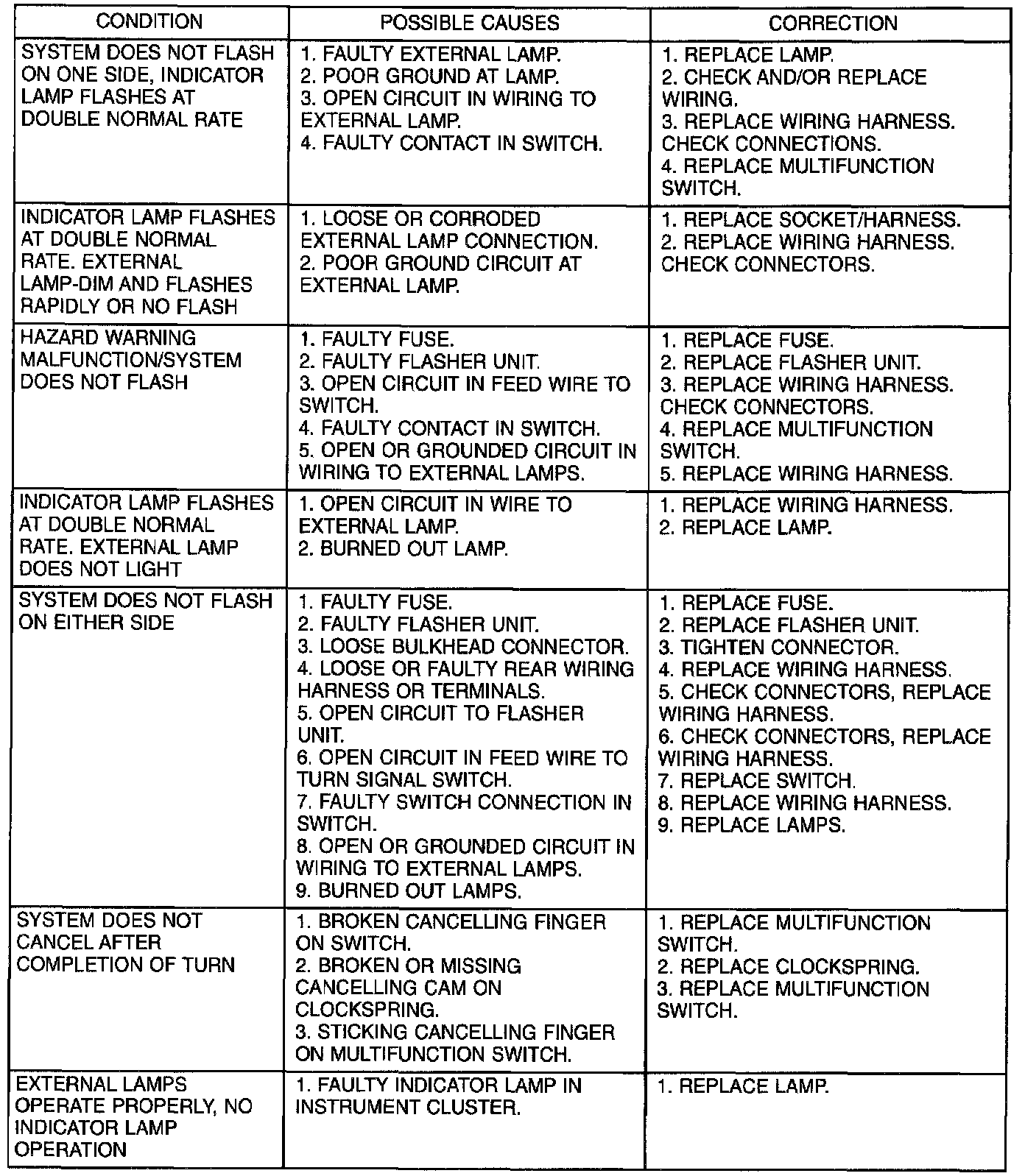 The multi-function switch contains electrical circuitry for turn signal, hazard warning, headlamp beam select, headlamp optical horn, windshield wiper, pulse wipe, and windshield washer switching. Refer to Windshield Wiper and Washer Systems for Wiper and Washer functions. This integrated switch assembly is mounted to the left hand side of the steering column. Should any function of the switch fail, the entire switch assembly must be replaced. Refer to Combination Flasher Diagnosis table.