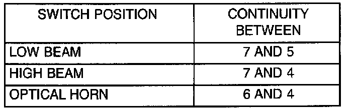 Using an ohmmeter, test for continuity (no resistance) between the terminals of the switch as shown in the Turn Signal and Hazard Switch Continuity and Beam Select Switch Continuity tables.