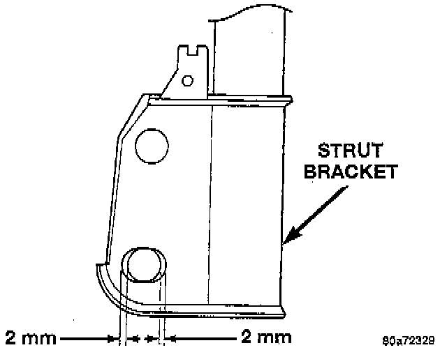 CAUTION: When grinding the bottom mounting hole in the strut to create the slot, do not enlarge the hole more then 2 mm in either direction as shown if the strut is not marked to show the shape of the slot.