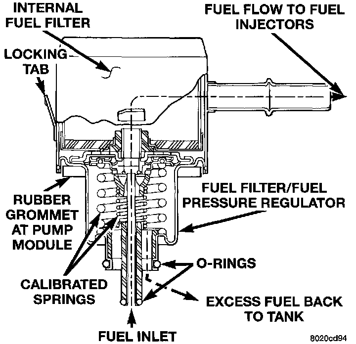 Fuel is supplied to the filter/regulator by the electric fuel pump through an opening tube at the bottom of filter/regulator.