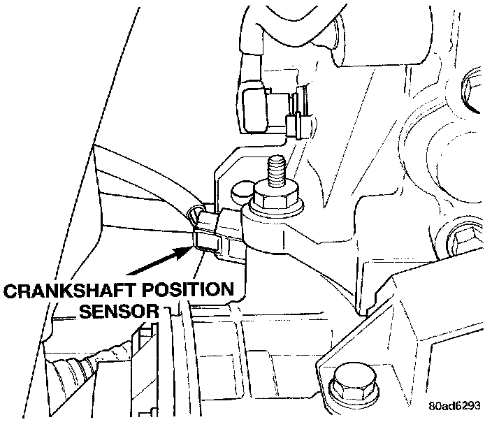 The crankshaft sensor is located on the passengers side of the transmission housing, above the differential housing (Fig. 8). The bottom of the sensor is positioned next to the drive plate.