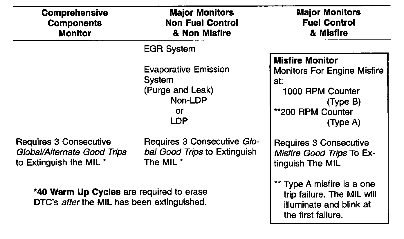 The table summarizes the various OBD II monitors operation.