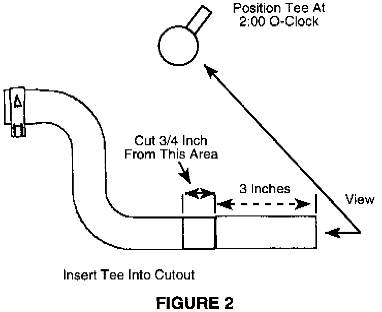 6. For both configurations, insert the Tee into the cut section of the heater hose. Use two hose clamps p/n 06502018 to complete the assembly. Before tightening the clamps, position the Tee to the 2:00 0-Clock position as viewed from the front of the vehicle (Figure 2).