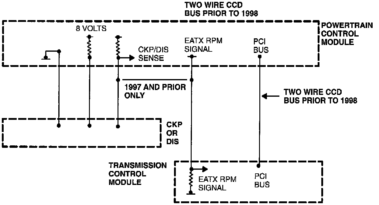 Beginning in 1998 MY, the PCM sends an engine speed signal to the TCM across the PCI Bus and the TCM does not receive a direct input from the CKP Sensor.
