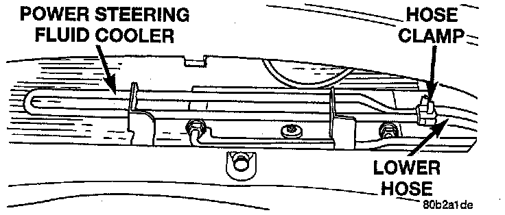 3. Remove the hose clamp from the lower hose at the power steering fluid cooler. Remove the lower hose from the power steering fluid cooler. Drain remaining power steering fluid from the hoses and the power steering fluid cooler.