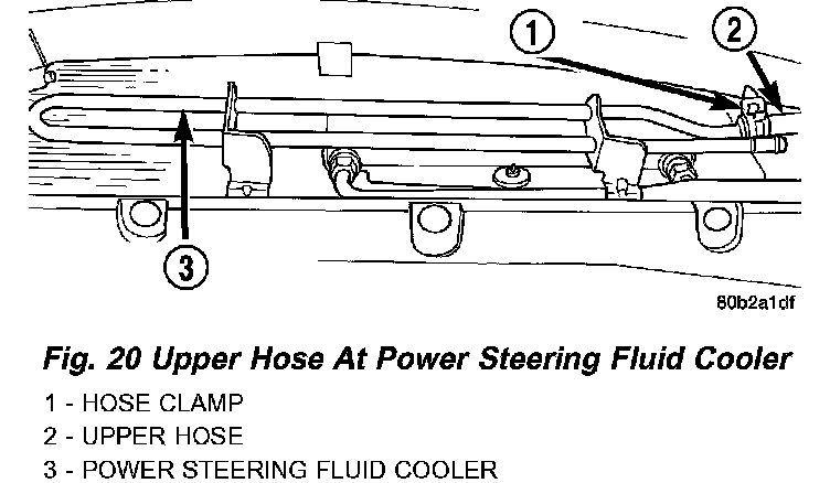 4. Remove the hose clamp and upper hose from the power steering fluid cooler.
