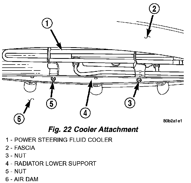 1. Install the power steering fluid cooler on the radiator lower crossmember.