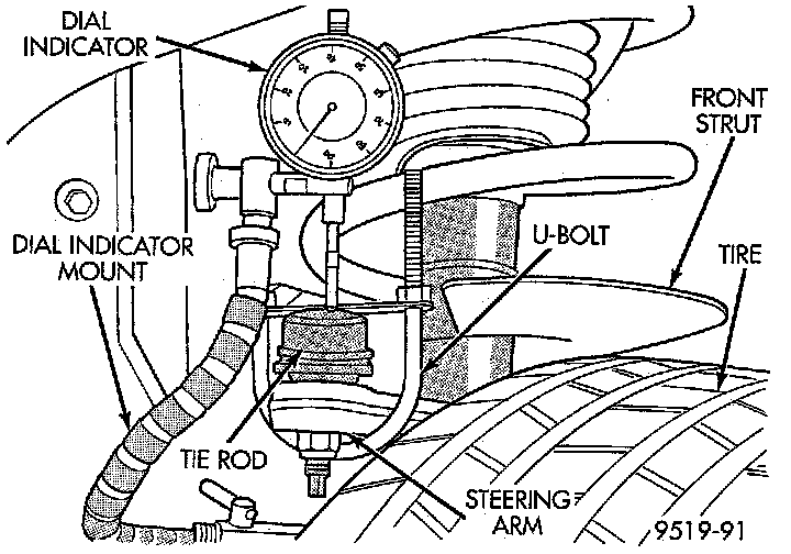 5. Position dial indicator in center of tie rod as shown. Zero the dial indicator gauge.