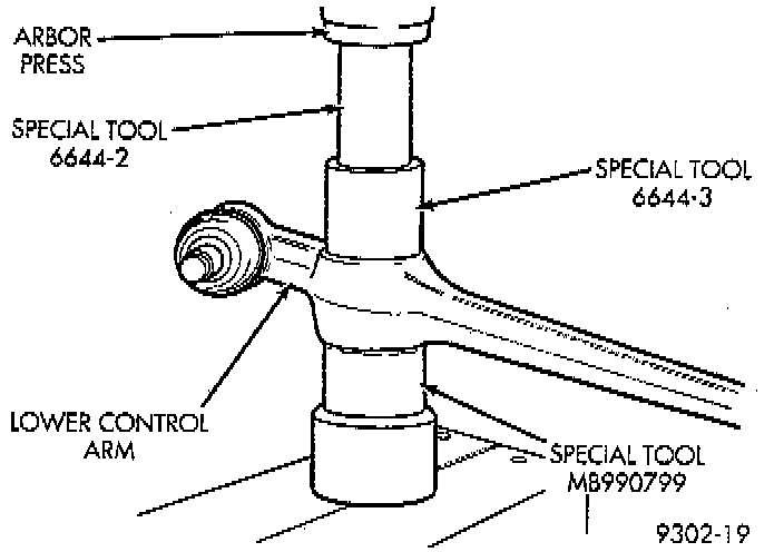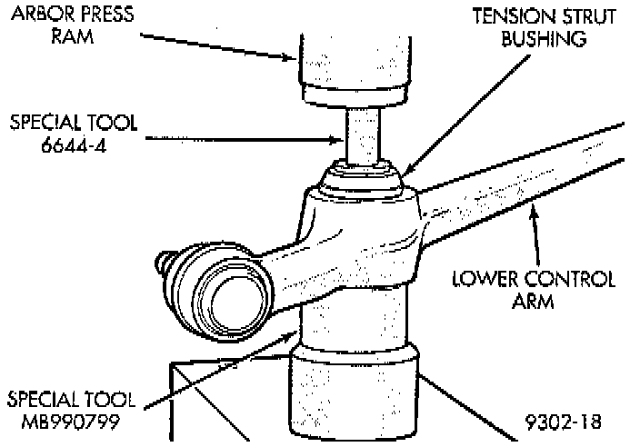 5. Position lower control arm in arbor press with tension strut bushing inside Receiver, Special Tool MB-990799 and special tool supporting lower control arm. Position Remover, Special Tool, 6644-4, or equivalent on top of tension strut bushing. Press Remover, Special Tool, 6644-4, or equivalent down through the tension strut bushing until the arbor press can push it no farther. As Remover, Special Tool, 6644-4, or equivalent is pressed down through tension strut bushing it will cut the bushing into two nieces.