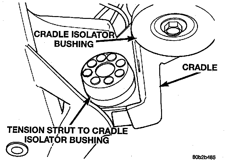 2. Remove the tension strut to cradle isolator bushing from the tension strut. Install replacement isolator bushing on tension strut until it is seated against retaining washer.