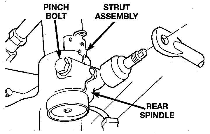 1. Install the spindle on the strut assembly. Push and or tap spindle assembly onto strut, until notch in spindle is tightly seated against locating tap on strut assembly. Then remove center punch from hole in spindle. Install the pinch bolt in the spindle. Tighten the pinch bolt to a torque of 53 Nm (40 ft. lbs.).