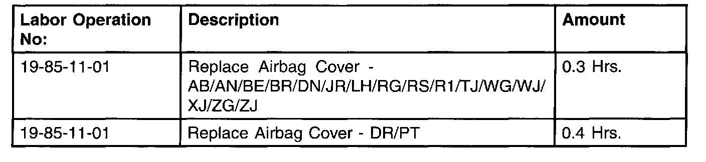 In most cases, the service manuals show driver airbag replacement procedures in the Restraints section of Group 8. Several MOPAR driver airbag cover packages include instruction sheets. Because of the long list of part numbers involved they are not listed here, please consult the MOPAR parts catalog for the correct part number(s).