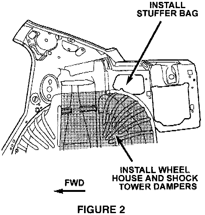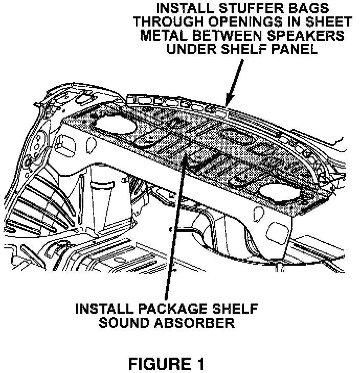 This bulletin involves installing an under package shelf silencer, a package shelf sound absorber, wheel house and shock tower dampers, and stuffer bags.
