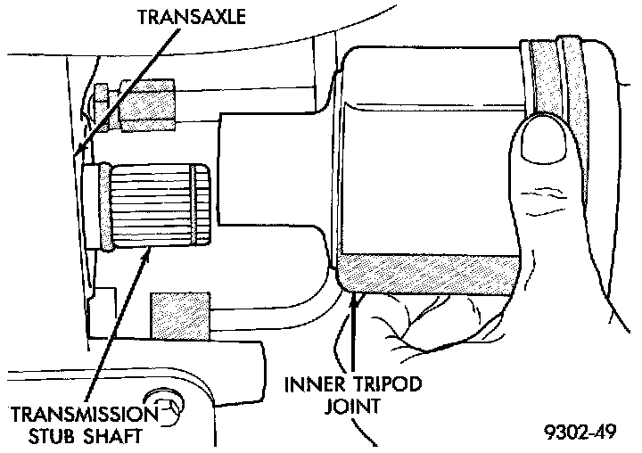 4. Continue pushing tripod joint onto transaxle stub shaft until it stops moving. The O-ring seal on the stub should not be visible when inner tripod joint is fully installed on stub shaft. To check that inner tripod joint retaining circlip is locked into tripod joint, grasp inner tripod joint and pull on it by hand. If circlip is locked into tripod joint, tripod joint will not move on stub shaft. To check that inner tripod joint retaining circlip is locked into tripod joint, grasp inner tripod joint and pull on it by hand. If circlip is locked into tripod joint, tripod joint will not move on stub shaft.