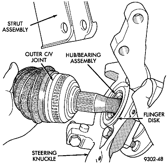 CAUTION: When installing outer C/V joint into the hub and bearing assembly, do not allow the flinger disk on hub and bearing assembly to become damaged. Damage to the flinger disk can cause dirt and water intrusion into bearing and premature, bearing failure.