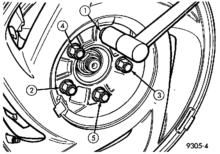 12. Install wheel and tire assembly on vehicle. Tighten the wheel mounting stud nuts in proper sequence, until all nuts are tightened to half specification. Then repeat the tightening sequence to the full specified torque of 129 Nm (95 ft. lbs.).