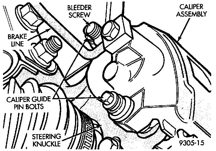 3. Remove the front caliper assembly from the front steering knuckle assembly.