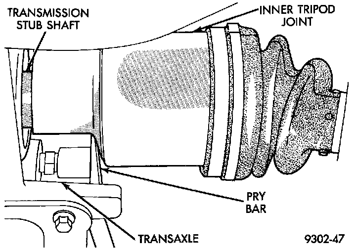 9. Dislodge inner tripod joint from stub shaft retaining snap ring on transaxle assembly. Inner tripod joint is dislodged from stub shaft retaining snap ring, by inserting a pry bar between transaxle case and inner tripod joint and prying on tripod joint. Only disengage the inner tripod joint from the retaining snap ring. Do not attempt to remove the inner tripod joint from the transmission stub shaft at this time.