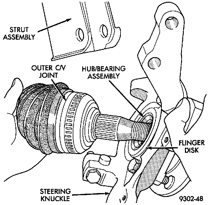 CAUTION: When removing outer C/V joint from hub and bearing assembly, do not allow the flinger disk on hub and bearing assembly to become damaged. Damage to the flinger disk will cause dirt and water intrusion into bearing. Premature bearing failure will result.