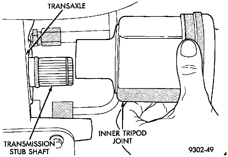 13. Remove driveshaft inner tripod joint from transaxle stub shaft. When removing driveshaft, do not pull on interconnecting shaft to remove inner tripod joint from stub shaft. Removal in this manner will separate the spider assembly from the tripod joint housing. Grasp inner tripod joint and interconnecting shaft and pull on both pieces at the same time.