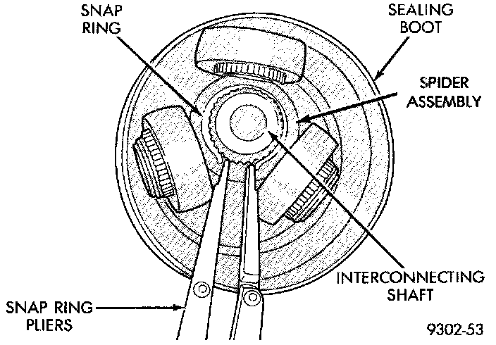4. Remove snap ring which retains spider assembly to interconnecting shaft. Then remove the spider assembly from interconnecting shaft. If spider assembly will not come off interconnecting shaft by hand, it can be removed by tapping the end of the spider body with a brass drift. Do not hit the outer tripod bearings in an attempt to remove spider assembly from interconnecting shaft.