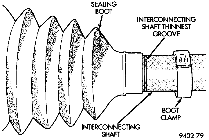 1. Slide inner tripod joint seal boot retaining clamp, onto interconnecting shaft. Then slide replacement inner tripod joint sealing boot onto the interconnecting shaft. Inner tripod joint seal boot MUST be positioned on interconnecting shaft, so only the thinnest (sight) groove on interconnecting shaft is visible.