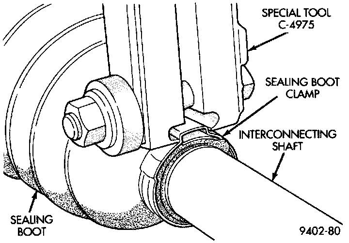 7. Clamp sealing boot onto interconnecting shaft using Crimper, Special Tool C-4975 and the following procedure. Place crimping tool C- 4975 over bridge of clamp. Tighten nut on crimping tool C-4975 until jaws on tool are closed completely together, face to face.