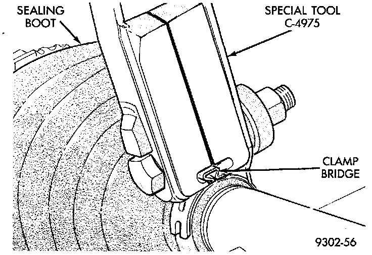 9. Clamp sealing boot onto tripod housing using Crimper, Special Tool C-4975 and the following procedure. Place crimping tool C-4975 over bridge of clamp. Tighten nut on crimping tool C-4975 until jaws on tool are closed completely together, face to face.