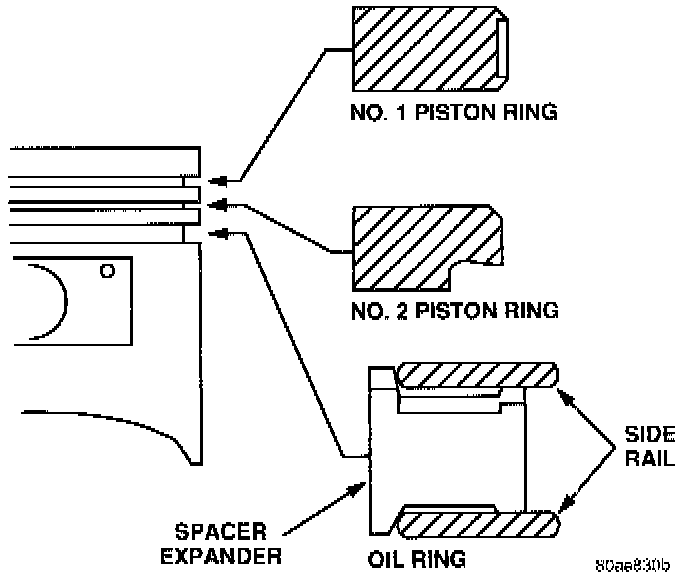 1. The No. 1 and No. 2 piston rings have a different cross section. Insure that the No. 2 ring is installed with manufacturers I.D. mark (dot) facing up, towards top of the piston.