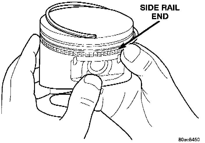 7. Install the side rail by placing one end between the piston ring groove and the expander. Hold end firmly and press down the portion to be installed until side rail is in position. Do not use a piston ring expander during this step.