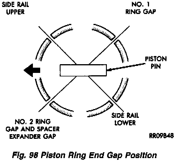 2. Before installing pistons and connecting rod assemblies into the bore, ensure that compression ring gaps are staggered so that neither is in line with oil ring rail gap.