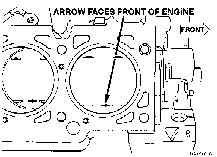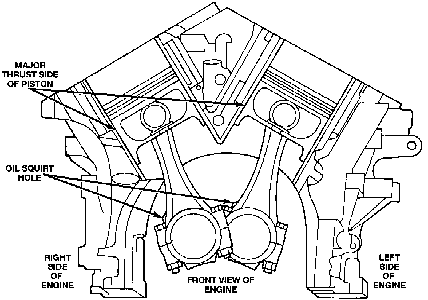 7. The arrow on top of piston must be pointing toward front of engine and oil squirt hole on connecting rod faces the major thrust (right) side of the cylinder bore.